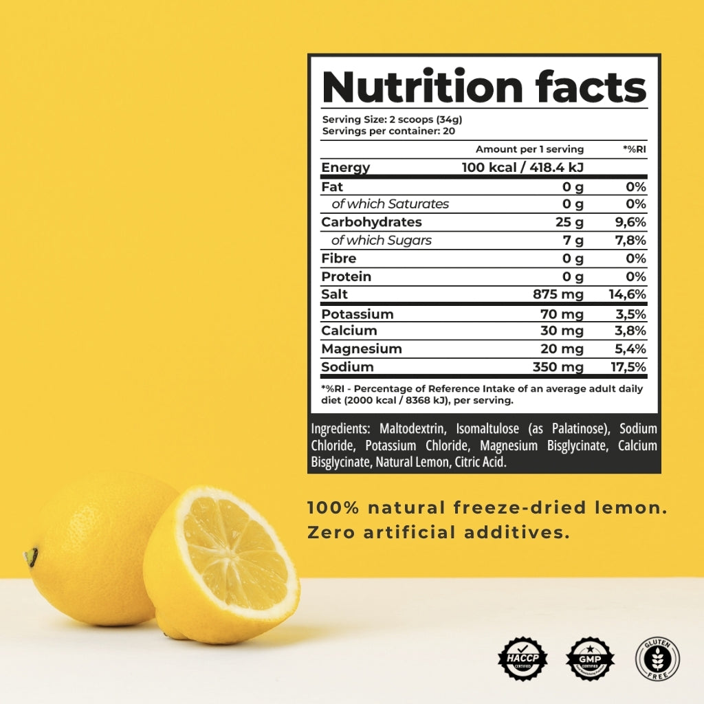 Ingredients: maltodextrin, isomaltulose (as Palatinose™), sodium chloride, potassium chloride, magnesium bisglycinate, calcium bisglycinate, natural lemon fruit, citric acid.