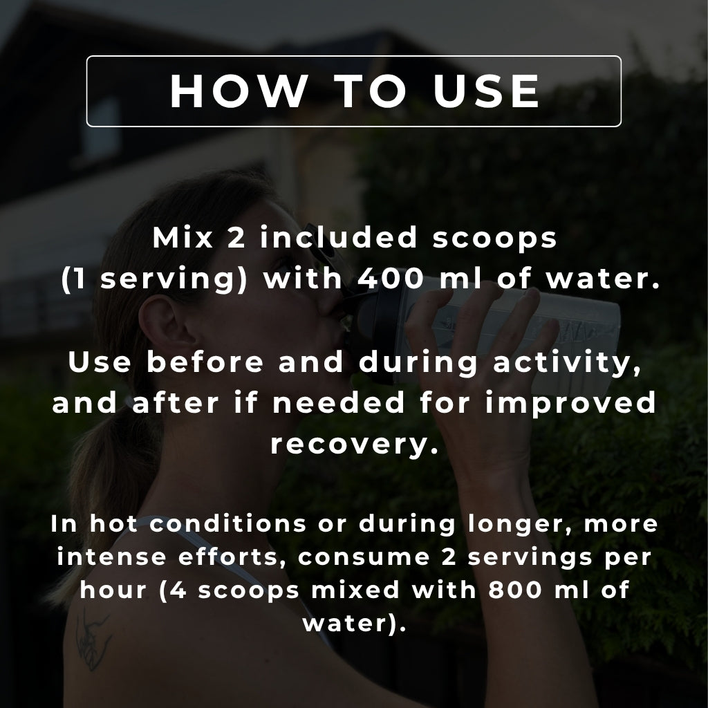 - For longer and more intense efforts, mix 4 scoops in 800 mL of water and consume once every hour.